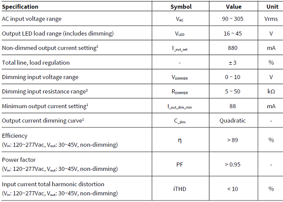 · Excellent current accuracy (±3%) across universal input voltage range (90 to 305 Vac) and wide output voltage range (18 V – 45 V)