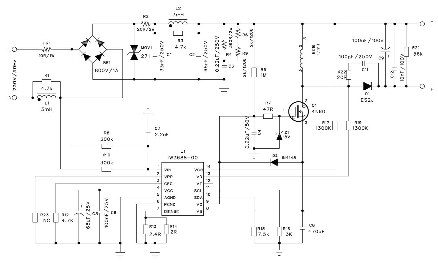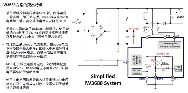 iW3688驅動方案的突出特點是,無需專門的bleeder或啟動電路,也無需輔助繞組,很簡化的外圍電路,只需要一個高壓功率MOSFET,可使用非常廉價的單繞組電感。